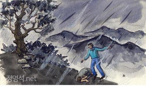 그렇게 소경에 대한 생각과 이 생각 저 생각을 하며 오는데 내 발에 무엇이 물컹 밟혔다. 비오는 밤이면 길바닥에 흔히 잘 나타나는 구렁이가 밟힌 줄 알고 나는 “으악”하고 소리를 지르며 뒤로 넘어져 주저 앉아 버렸다. 그런데 웬걸, 신음 소리가 나는 것이다. 비상으로 가지고 다니던 성냥불을 켜 보았다.
