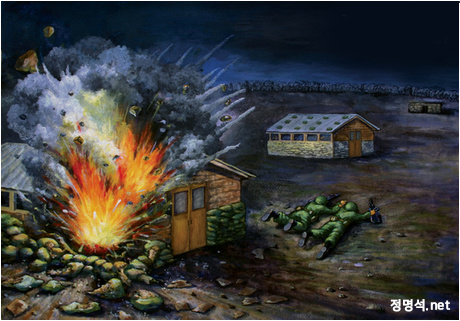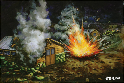 그러면서 몇 발자국 더 걸어가는데, 그 순간 귀청이 찢어지고 가슴이 터지도록 ‘꽝!!!’ 하고 불꽃이 튀며 순간 벼락이 친 것처럼 주변이 환했습니다. 둘은 앞으로 고꾸라져 “적이다!” 했습니다. 방금 전에 우리가 나온 내무반 막사에 적들이 쏜 포탄이 떨어진 것입니다.